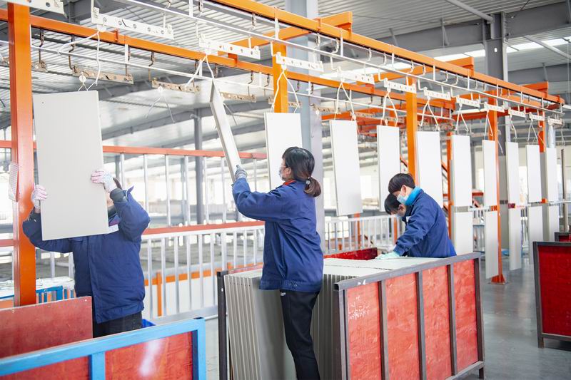 圖為:萊特工廠噴涂生產(chǎn)線員工正在將待噴圖的產(chǎn)品掛入到移動(dòng)的噴涂軌道中