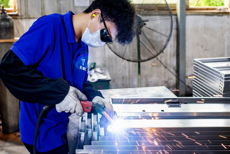 圖為:萊特工廠內(nèi)的點(diǎn)焊工序的員工對(duì)產(chǎn)品進(jìn)行點(diǎn)焊操作